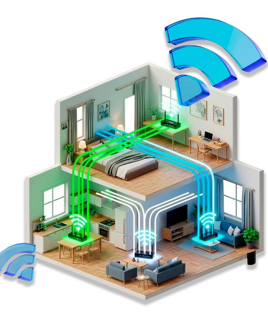 Com o ponto extra toda a sua casa fica coberta pelo sinal Wi-Fi e você consegue navegar na internet até naqueles cômodos mais distantes. Ao incluir o serviço na sua assinatura de internet, será agendada uma visita técnica para instalar um segundo equipamento: o roteador Mesh. Os roteadores ficam conectados via cabo, e de uma forma inteligente criam uma super cobertura de sinal em toda residência. Dessa forma o seu dispositivo (celular, TV, tablet, notebook ou qualquer outro dispositivo que funcione com o sinal Wi-Fi) identifica qual dos roteadores tem o melhor sinal no cômodo em que você se encontra. É possível adicionar mais pontos extras de Wi-Fi e todos funcionarão em conjunto em uma única rede, você fica livre de “procurar” pelo melhor sinal.